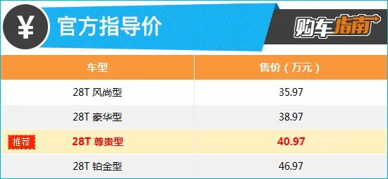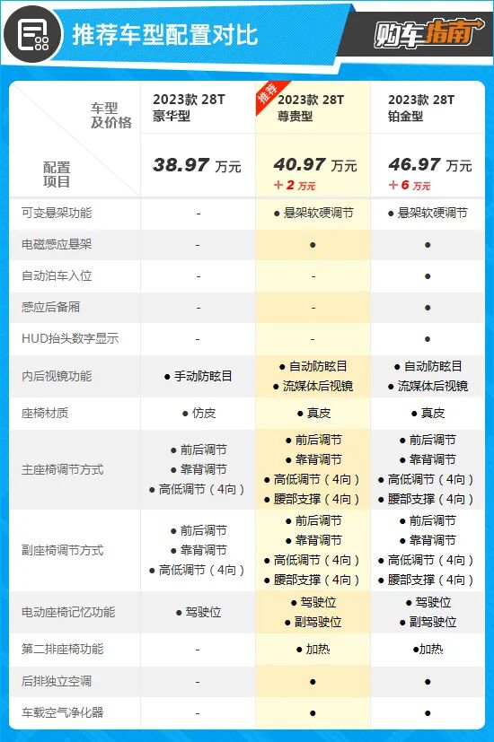 为了照顾后排乘客的体验,我们更推荐次顶配车型,也就是尊贵型。其为后排乘客提供了座椅加热以及独立空调等功能,同时在驾驶层面还增加了可变软硬的电磁悬架系统以及流媒体后视镜,表现更为周到,能让车内每一名乘客都得到舒适的驾乘体验。更重要的是,推荐车型的价格只比低一档车型高出了2万元,换来的配置却是物有所值的,在全新车型中性价比表现最为突出。