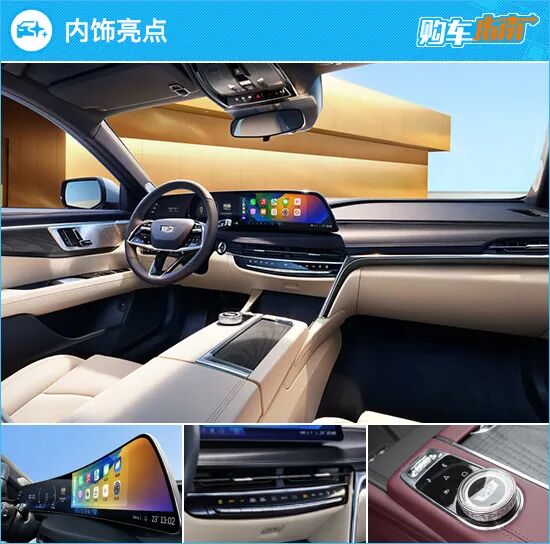 内饰方面,全新凯迪拉克CT6采用环抱式游艇设计,悬浮式的33英寸9K高清曲面屏集成了仪表盘和多媒体触屏功能,内置8155芯片,并支持5G连接。同时在配置上,新车还提供了NAPPA真皮和白栓木装饰,以及门斯之盾晶钻旋钮和26色可调车内氛围灯等。