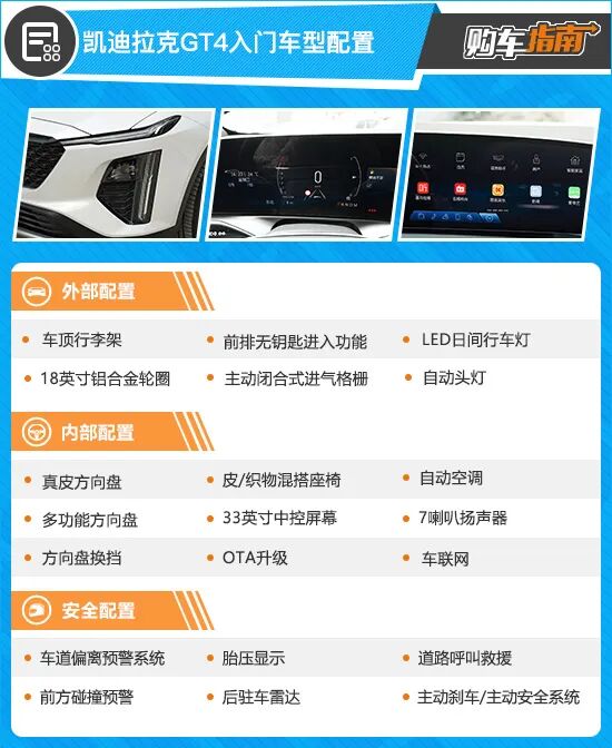 凯迪拉克GT4基于通用E2XX平台打造而来,目前共推出4款车型,售价区间为21.97-30.97万元。针对目前购车的用户,厂商还推出了增换补贴礼、省心质保礼、0负担轻松购等多重礼遇,助力年轻消费者购买人生第一台豪华品牌轿跑SUV。
