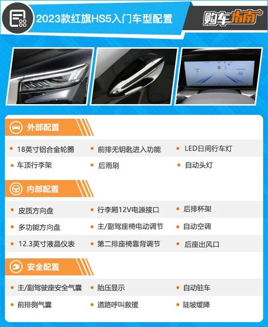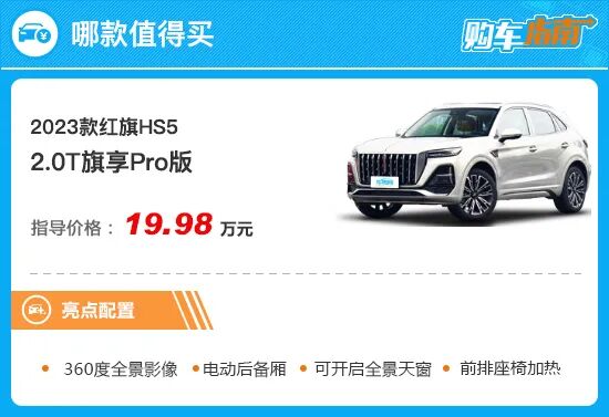 2.0T旗悦Pro版是2023款红旗HS5的入门车型,售价为18.38万元。对于自主品牌来说,这样的价格显然不算低,不过这款车型的配置并不能让人满意,缺失座椅部分舒适性功能、主动安全配置等。另外,对于这样一台尺寸不小的中型SUV来说,仅配备倒车影像,泊车难度确实会增大不少,用车体验有落差。如果预算不是特别紧张,我更建议您看看2.0T旗享Pro版。