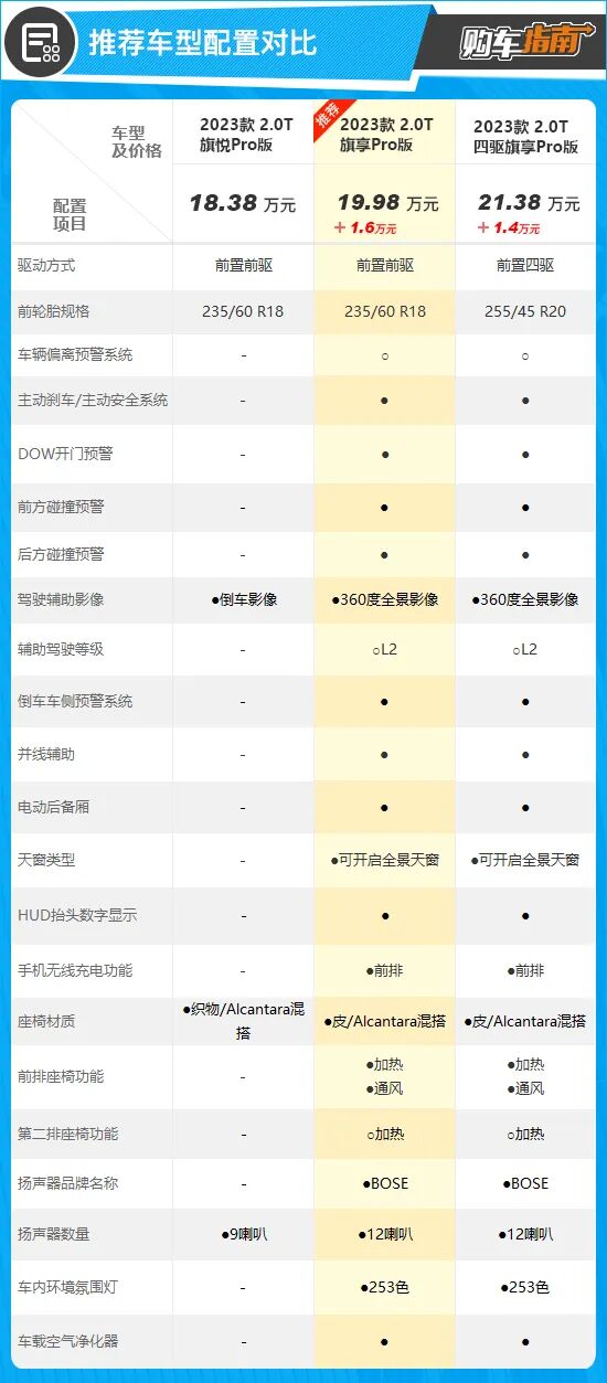 2.0T旗享Pro版是2023款红旗HS5全系最推荐购入的车型,这台车型明显补齐了入门车型在配置层面的短板,包括材质更高档的座椅、前排座椅通风和加热、较为完善的主动安全配置、BOSE品牌12喇叭音响系统、电动后备厢等,在舒适性、安全性以及用车便利性方面,皆有着较大提升。在这台车型上,才能开始感受到一台高品质中型SUV应有的体验。综合来说,配置对应到价格物有所值,值得推荐。
