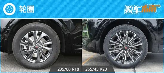 2023款红旗HS5原厂提供了两种规格的轮圈,入门以及次低配车型搭载18英寸铝合金轮圈,匹配规格为235/60 R18的轮胎;其余车型皆搭载20英寸轮圈,匹配胎面更宽、扁平比更低的运动轮胎,具体规格为255/45 R20。