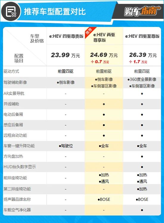 通过配置对比,小编向您推荐次顶配,也就是2023款e:HEV 两驱尊享版。推荐车型不仅补齐了上述缺失的配置,较四驱尊贵版还多出了电动后备厢、感应后备厢、远程启动以及全车车窗一键升降等便利性功能。同时,还有前排座椅加热/通风等舒适性配置和BOSE品牌音响加持,用车体验会更加出色。售价上也仅需增加0.7万元,性价比足够高。此外,作为一台城市SUV,两驱版车型足以应对各种路况,因此消费者无需过于纠结是否选择四驱版本车型。