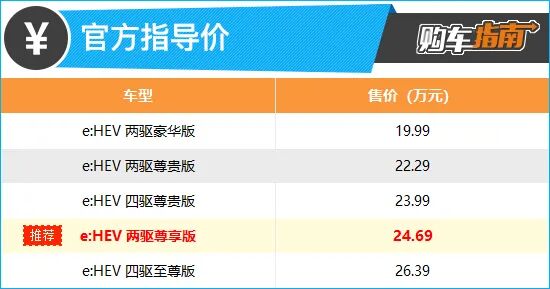 2023款皓影e:HEV共推出5款车型,售价区间为19.99-26.39万元。与此同时,官方还推出了焕新礼、金融礼、保险礼以及保养礼等专属礼遇(详情请咨询当地经销商)。