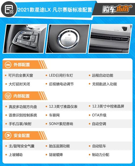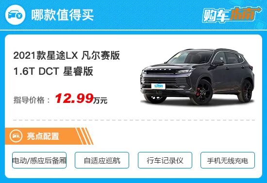 2021款星途LX 凡尔赛版的入门车型为1.6T DCT星耀版,售价为11.99万元,该车整体配置还算是比较丰富,例如外部的无钥匙进入、远程启动、LED远近光大灯以及大灯延时关闭等功能都有体现。在内部,入门版车型还配备了双12.3英寸连体大屏幕,其搭载的车联网、导航以及多媒体功能也满足了我们日常使用。在安全配置上,入门车型配有主副驾驶安全气囊、前排侧气囊、全景影像、胎压监测、自动驻车等,提升了行车安全性和停车便利性。但不足之处在于,电动/感应后备箱、手机无线充电、内置行车记录仪以及外后视镜功能的缺失,令自身在实用性方面有所欠缺。总的来说,如果您预算有限且针对细节配置没有太多需求的话,完全可以选择入门车型。