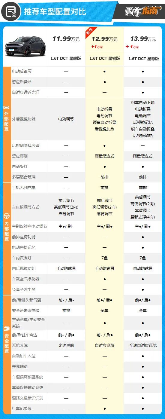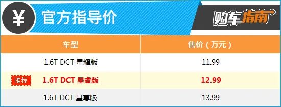对于追求配置更加全面的消费者来说,显然1.6T DCT 星睿版值得推荐,虽然该车比入门仅多出了1万元,但是从配置表来看,推荐车型在外部增加了电动/感应后备箱,同时在灯光方面还加入了自动头灯,增加了自身的高级感。此外,后视镜加热、手机无线充电、自适应巡航、行车记录仪这些功能也很实用。