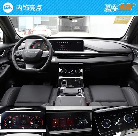 星途LX凡尔赛版内饰沿用了普通版车型的设计语言,中控台采用了大量软质材料包裹,彰显档次感。配色上,凡尔赛版本取消了棕色内饰配色,仅保留了黑色内饰,与黑化的外观相呼应。新车标配了双12.3英寸连体大屏,屏幕显示清晰,可提供酷睿、酷炫以及酷潮三种显示主题。
