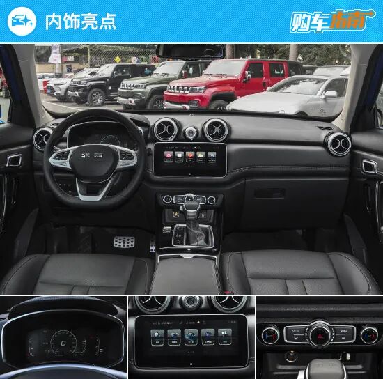 10.4英寸半悬浮式中控大屏为全系标配,内部支持蓝牙电话、百度Car-Life手机互联功能。除入门车型外,其余两款车型还配备了GPS导航、语音识别、车联网功能。在内部其他配置上,两款高配车型还配备了7英寸液晶仪表、真皮方向盘、主驾驶座椅电动调节以及自动空调功能。而在顶配车型上还独享前排座椅通风、加热、驾驶座记忆功能。值得一提的是,BJ30用户还可免费享受十年基础流量和三年媒体流量服务。