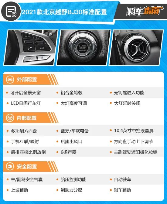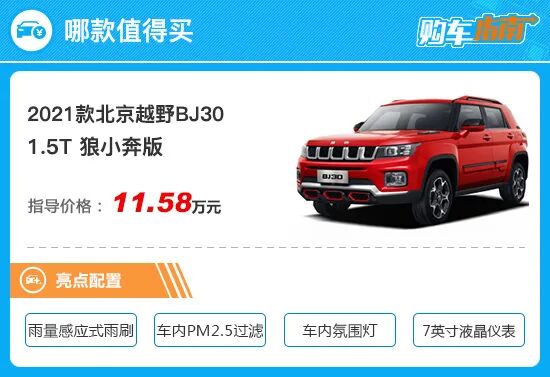 2021款北京越野BJ30的入门车型为1.5T 狼小美版,该车起售价为10.58万元,在配置上,入门车型配备了LED前大灯,大灯延时关闭以及无钥匙进入等功能,在内部还配有多功能方向盘、10.4英寸液晶中控屏以及手机互联等基础配置,可满足基本的日常使用。但是在安全配置方面就比较寒酸,仅配备了胎压监测、后倒车雷达等。可以说入门车型仅能保障最基本的使用需求,无法提供更为全面的用车感受,因此并不做推荐。