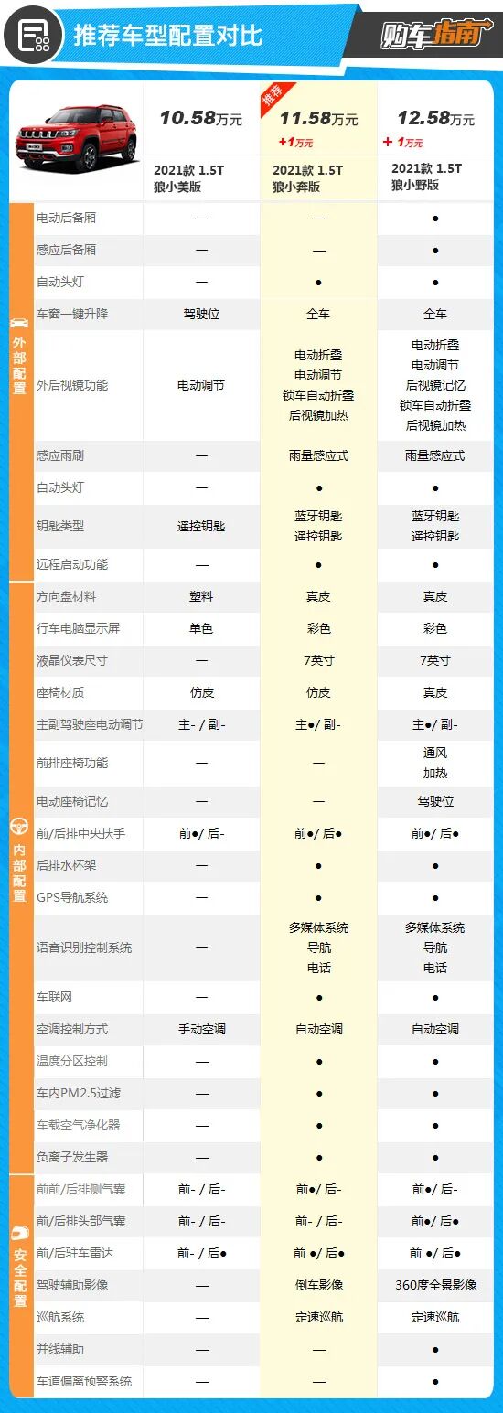 至于顶配车型来说,该车比推荐车型仅多出了电动/感应尾门,后视镜记忆、前排座椅加热通风等功能,同时在安全配置上也由倒车影像更换为了全景影像,并加入并线辅助和车道偏离预警,这些功能的加入虽然能显示出作为顶配车型的高级感,但对于选择硬派越野车型的消费者而言,并不是那么看重。更重要的是,价格要比推荐车型贵出1万元,性价比并不高。总的来看,1.5T小狼奔版在三款车型中综合性价比较高,建议在购买时可优先考虑。