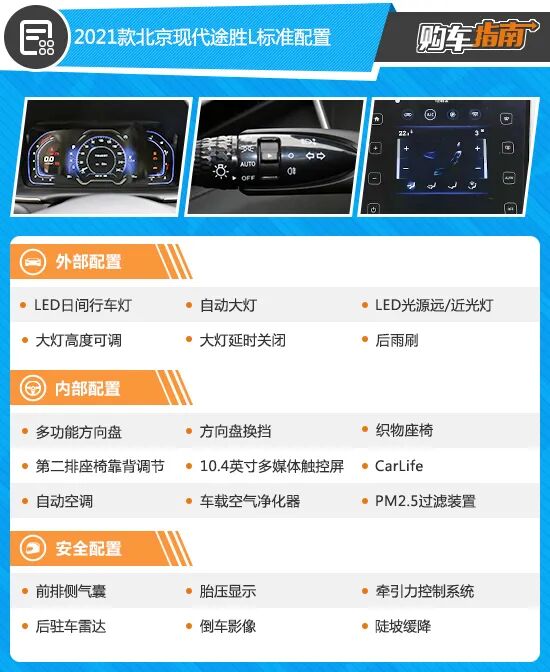 2021款北京现代途胜L的入门版车型配置表现中规中矩,比如很有特点的LED分体式前大灯、自动大灯、自动空调、方向盘换挡以及10.4英寸纵置多媒体大屏等功能,均有所配备,能够满足日常使用需求。但是,最低配的GLS领先版落地价也接近20万元,这样的配置表现,尤其是舒适性配置方面,显然还不够。