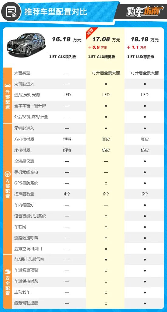 而与次顶配的LUX尊贵版相比,后者仅比推荐车型多出了全液晶仪表、前排手机无线充电、副驾驶座椅电动调节、前排座椅加热、车机互联功能以及多项主动安全配置,看上去琳琅满目,但结合两者1.1万元的差价分析,这些配置并不会对用车体验产生质的提升。更重要的是,推荐车型与LUX尊贵版配置间的差距,可通过丰富的选装来弥补,消费者可以根据自身实际需求去选择,自主性更强。所以综合来看,2021款北京现代途胜L 1.5T GLX精英版的性价比相对较高,购车时可优先考虑。