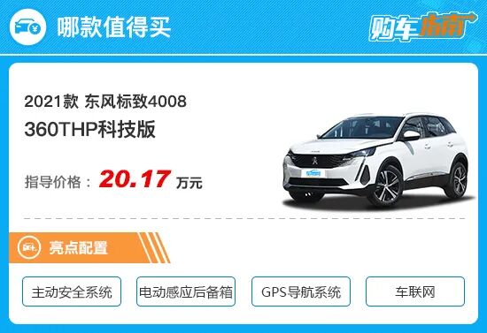 对于新款东风标致4008车型,个人首推售价为20.17万元的360THP科技版。虽然这款配置车型仅搭载了1.6T发动机,但无论参数表现还是驾驶感受,都完全能够满足日常使用,实在没有升级1.8T发动机的必要。400THP科技版车型价格为21.17万元,配置与推荐车型完全一致,因此这1万元的差价,个人感觉并不值得。