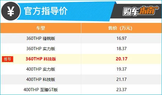 低一个配置版本的400THP 实力版虽然相较推荐车价格便宜了8000元,但是除了1.8T发动机之外,配置表现几乎是被全面碾压。推荐车型不仅配备了丰富的主动安全系统,而且电动后备箱、前排座椅加热、后排中央扶手以及车联网等功能的加入,也进一步提升了实用性,如此看来,这8000元的差价绝对算是物超所值。