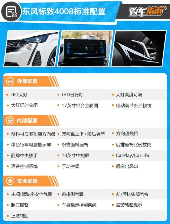 新款东风标致4008入门版车型为360THP 锋锐版,售价16.97万元。配置方面,入门版车型的表现并不尽如人意,虽然配有LED大灯、多功能方向盘、方向盘换挡以及10英寸中控屏,看似实用性还说得过去,但是像倒车雷达以及倒车影像却均需要选装才能得到。此外,包括自动大灯、天窗、液晶仪表、座椅电动调节、GPS导航以及自动空调等配置,入门版车型也都没有配备,结合16.97万元的价格来看,性价比确实不高,因此并不建议入手。