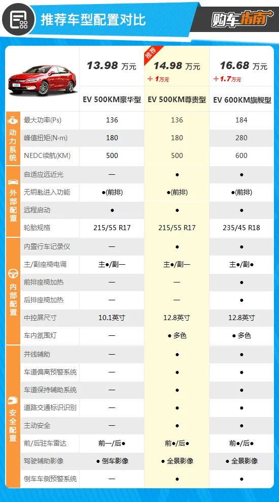 而推荐车型较EV 500豪华型内部新增加了行车记录仪,为车主省去了后期加装的费用与时间,多色氛围灯的加入也使得车内更加时尚,同时中控屏尺寸也有所加大,驾驶者操作起来十分便捷。更重要的是,推荐车型在主动安全配置层面表现更加完善,比如新增加了并线辅助、车道偏离预警系统、主动安全和 360°全景影像等,全面保障了驾驶员行车安全性,相应的售价仅多出1万元,可谓性价比十足。