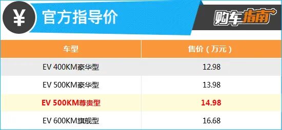 如果您的预算足够,小编向您推荐EV 500尊贵型。需要指出的是,之所以不推荐EV 500豪华型,是因为其与EV 400豪华型仅续航里程有所不同,配置方面则完全一致。