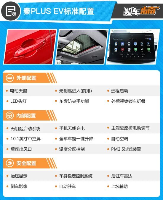 通过配置表不难发现,比亚迪秦PLUS EV入门版车型在配置方面颇为厚道,外部配备了实用的无钥匙启动、远程启动以及外后视镜锁车自动折叠,同时还配备了国内消费者喜闻乐见的电动天窗。内部则诸如手机无线充电、无钥匙启动、10.1英寸中控屏、自动空调、后座出风口等使用率较高的配置均有所配备。不过,相对而言,入门版本车型在主动安全配置层面有所缺失,对于新能源车型而言,安全性尤为重要,因此并不推荐。