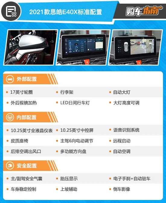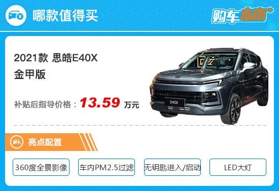 思皓E40X的入门车型为银甲版,该车售价为13.00万元,在配置上,入门车型配备了17英寸轮圈、行李架、自动大灯和外后视镜加热等功能,在内部还配有10.25英寸全液晶仪表、10.25英寸中控屏、语音识别系统、皮质座椅、主驾6向电动调节、远程启动和后排空调出风口等配置。作为10-15万级小型电动SUV来说,新车入门车型的配置比较丰富,尤其是内部配置的丰富让它完全没有丐版的寒酸。
