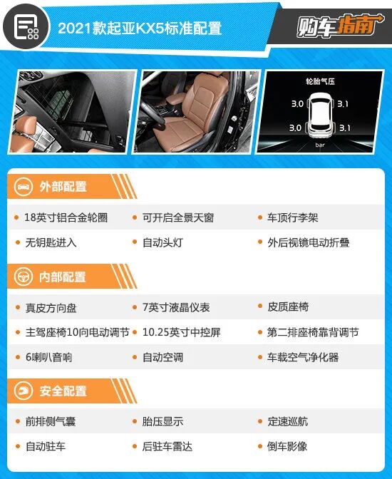 在标准配置方面,新车表现对得起起亚KX5性价比担当的名号,而且无论是外部还是内部,排面配置都是无差别对待,比如18英寸轮圈、全景天窗、双液晶屏都让入门车型绝不容易让人一眼看穿,一点都不寒酸;而且在功能性上,主驾座椅10向调节和第二排座椅靠背调节也是非常实用的,还是比较值得考虑的。