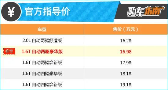 而对于高配车型来说,相比推荐车型仅多出了感应电动后备厢、头部气帘、并线辅助、360度全景影像和自适应巡航等锦上添花的配置,考虑到高配车型要比推荐车型贵出1万元,性价比就稍显逊色了。总的来看,1.6T自动两驱豪华版在5款车型中综合性价比相对较高,建议在购买时可优先考虑。
