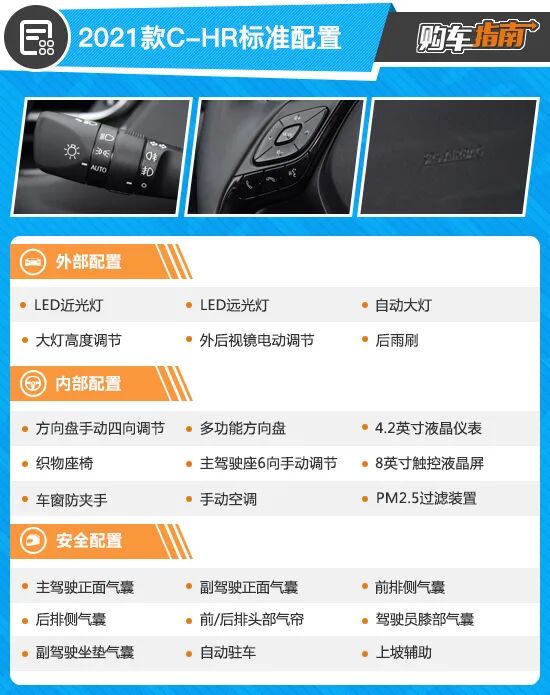 配置方面,新款C-HR依旧提供了相对完善的主被动安全配置,全系标配了车身稳定系统、胎压监测、坡道辅助、10气囊、ISO-FIX座椅接口等配置,并且除入门车型外,其余车型还配备了丰田智行安全系统(TSS),包括预碰撞安全系统、自适应巡航、车道偏离警示+辅助修正,以及自动远光四项主动安全配置。此外,新款C-HR还提供了电子手刹、四门车窗一键升降、无钥匙进入/一键启动、nanoe纳米水离子发生器、双区自动空调等,满足消费者对驾乘舒适性的需求。