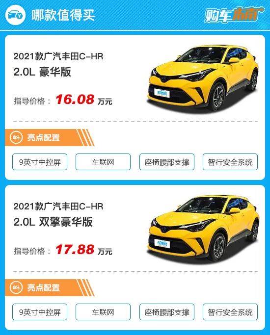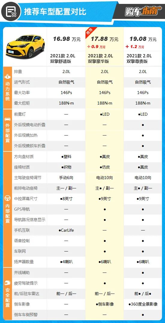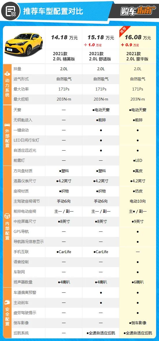 而顶配车型尊贵版售价为19.08万元,已经逼近20万元大关。相比推荐车型增加的配置比较有限,包括并线辅助、前后雷达、360度全景影像、倒车车侧预警、外后视镜电动折叠/加热等,这些功能虽然实用性很强,但大多数都可通过后期加装来解决,因此并非刚需配置。因此,综合配置、售价等因素来看,价格相对适中且配置搭配合理的2.0L豪华版和2.0L 双擎豪华版在新款C-HR全系车型中具有更高的性价比,至于选择燃油版还是双擎版,消费者可根据自身需求来决定。