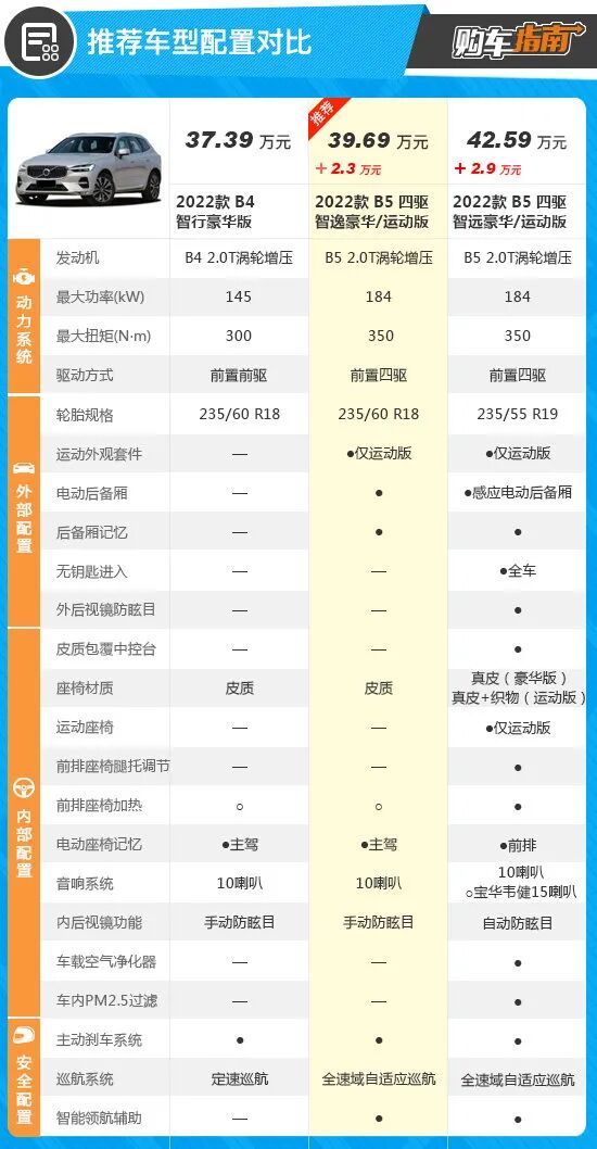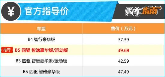 总的来看,B5 四驱智逸豪华版和运动版车型在6款车型中综合性价比较高,建议在购买时可优先考虑。而由于这两款车型的售价相同,配置也相差无几,仅在外观上有所区分,至于选择哪款,就看您个人喜好了!