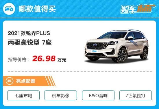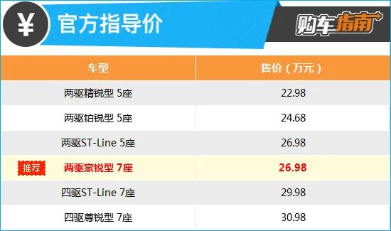 综合来看,小编向您推荐7座的入门版,也就是两驱豪锐型,售价26.98万元。通过配置来看,推荐车型与低一级别的5座顶配车型售价相同,但从配置层面来看,除座椅布局有所差别外,推荐车型新增了后排独立空调与B&O音响,同时副驾驶的调节范围也由6向升级到8向,更为实用。既然售价相同,7座版车型显然性价比要更高一筹。