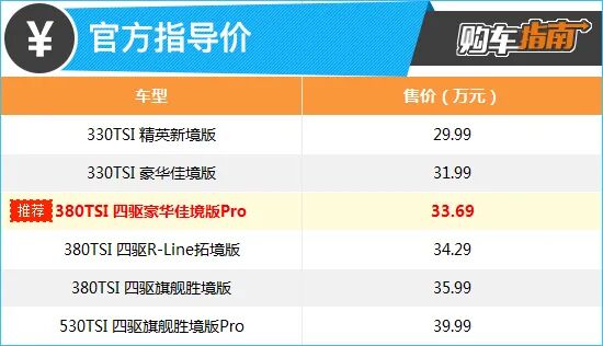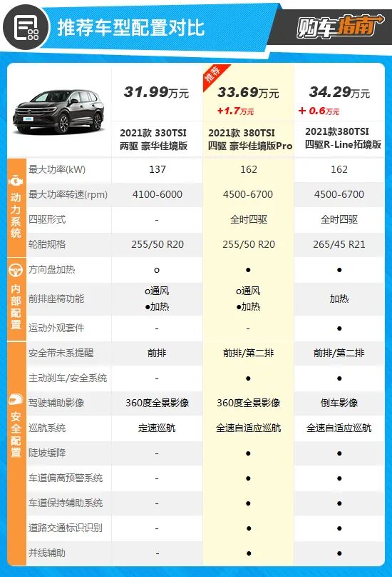 相比之下,更高一级的380TSI 四驱 R-Line拓境版来说,最主要的是比推荐车型多出了运动外观套件而已,而驾驶辅助影像从推荐车型的360度全景影像降为倒车影像,其他配置则与推荐车型相差不大,而在购买时还要多支付0.6万元,显然性价比不高。综合来看,380TSI 四驱豪华佳境版Pro的性价比表现更加突出,在选购时可优先考虑。