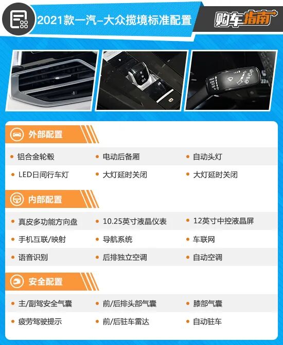 作为一汽-大众旗下的旗舰SUV,揽境在配置方面的表现还算厚道, 10.25英寸液晶仪表以及12英寸中控大屏烘托出车内的科技感。在配置方面,分区空调、后排独立空调、车内PM2.5过滤功能以及CNS 3.0系统的加入,满足日常使用完全不成问题。但不足之处在于,入门车型并没有配备天窗、座椅还是织物+皮质混搭设计,同时在功能方面也缺失了通风、加热以及第二排座椅电动调节等舒适性配置。总的来说,入门版车型虽然并没有因“入门”二字而过多的降低配置,但就其旗舰SUV的定位而言,配置层面的确有还有一些不足之处。