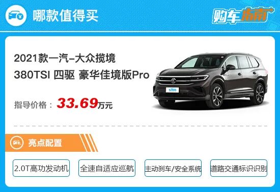 一汽-大众揽境入门版车型虽然可以满足基本的使用,但配置层面与其旗舰SUV的定位不符。对于车辆舒适性和安全性配置更为看重的消费者来说,显然380TSI 四驱豪华佳境版Pro更值得购买。推荐车型在外部配置上较为全面,例如LED大灯、可开启全景天窗、雨量感应式雨刷等该有的都有。而在内部配置上,还配备了方向盘加热、前排座椅加热功能,进一步提升了用车舒适度。更重要的是,2.0T高功率发动机以及四驱系统的加入,不仅增加了该车的操控性能,还增加了车辆在户外的通过能力。在驾驶层面,推荐车型还加入了一套驾驶辅助系统,包括车道偏离预警、车道保持辅助等,这些功能的加入直接将该车的“逼格”拉满,并且比前者仅多出了1.7万元,可谓物超所值。