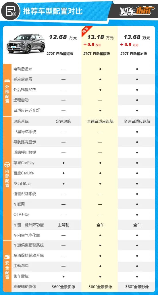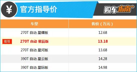 此次推荐的270T 自动星辰版为次低配车型,与入门的270T 自动星耀版相比,增加了多项主动安全配置,同时在实用性方面还多出了感应式电动尾门、外后视镜加热、全速自适应巡航、全车车窗一键升降、自适应远近光灯以及车内空气净化器等配置,且两者差价仅为5000,元,相当超值。