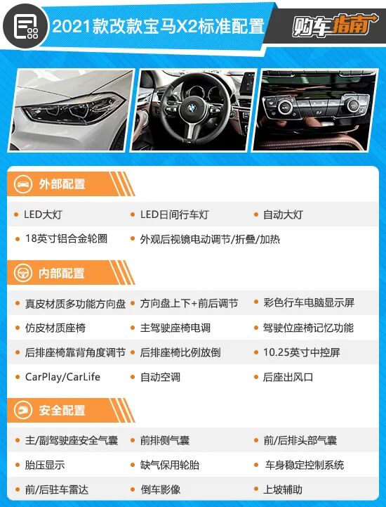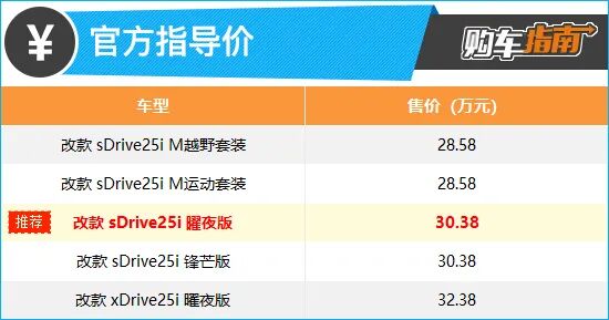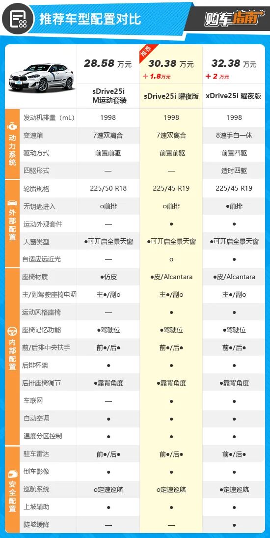 顶配车型为xDrive25i曜夜版,售价32.38万元,相比推荐车型贵了2万元。配置方面标配前排无钥匙进入、自适应远近光,并且还增加了陡坡缓降功能,进一步提升了实用性。此外,这款配置也是全系唯一搭载四驱系统以及8速手自一体变速箱的车型。对于厌恶双离合变速箱的消费者来说,四驱版车型使用的8速手自一体变速箱的确颇具吸引力,但是对于这样一款定位明显是城市化倾向的SUV来说,四驱系统貌似又显得有些多余了。客观来说,为了配置提升、四驱系统以及8速手自一体变速箱,多花费2万元升级至顶配版倒也并非不值得,只是没这个必要而已。况且,32.38万元的价格对于一款尺寸不大的紧凑型SUV,也的确难言性价比。综上所述,还是售价30.38万元的sDrive25i曜夜版性价比更高,消费者在购买时可以优先考虑。