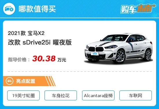 对于新款宝马X2,个人首推售价30.38万元的sDrive25i曜夜版。相比M套装版,推荐车型贵了1.8万元,配置方面增加了运动套件、运动座椅以及车联网功能,座椅材质升级为皮/Alcantara混搭,另外还增加了自适应远近光的选装机会。其实相比于配置升级,sDrive25i曜夜版在外观方面的提升才更能彰显其性价比,包括个性的车身拉花以及运动感十足的轮圈样式,都非常吸引人。综合配置及外观方面的提升,这1.8万元的差价也还算合理。