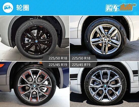 除了在外观设计上有所区别,宝马X2的轮毂样式也不尽相同。尺寸方面分为两个级别,两款M套装版车型的轮胎规格为225/50 R18,而锋芒版以及两款曜夜版车型则升级为225/45 R19。