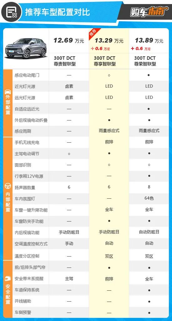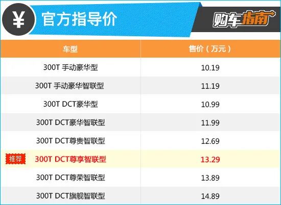 在8款车型中,新车共分为豪华型、豪华智联型、尊贵智联型、尊享智联型、尊荣智联型和旗舰智联型6个配置级别,各级别差价多在7000元左右,可供消费者选择的范围也很广。经过比对,其中最值得推荐的当属中高配车型——尊享智联型。