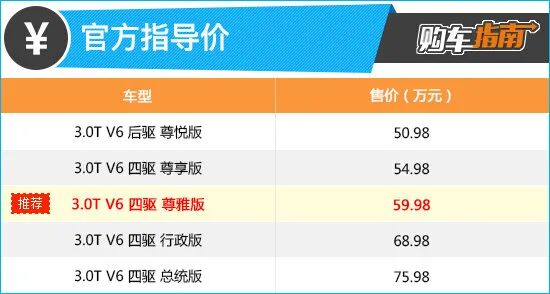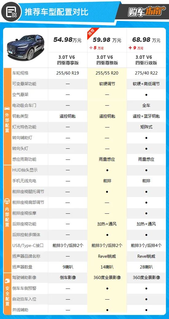 在5款车型中,最值得推荐的当属中配车型——四驱尊雅版。推荐车型相比四驱尊享版增加软硬可调的自适应悬架系统,乘坐舒适性更有保障,并且在座椅功能上有大幅提升,同时也加入了配备14喇叭的Revel锐威音响,更能突出美式豪华氛围。另外,新车在主动安全配置也更加丰富,倒车影像升级为360度全景影像。综合下来,推荐车型相比低一配置车型的差价为5万元,还是很划算的。