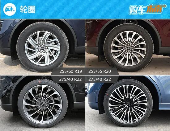 轮圈方面,新车5款车型共提供4款轮圈,不可谓不丰富,不过4款轮圈的风格基本一致,均为“涡扇”造型,仅在细节尺寸上有所不同。其中入门两款车型为19英寸亮面轮圈,中配车型为20英寸亮面轮圈,次顶配车型为22英寸双色轮圈,顶配车型为22英寸亮面轮圈。编者认为22英寸轮圈更能体现美式豪华,并且次顶配车型的22英寸双色轮圈立体感和设计感最强。