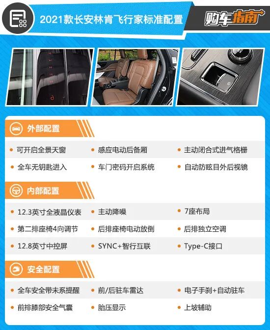 新车全系标配7座布局、12.3英寸全液晶仪表、主动降噪、第二排座椅4向调节、后排座椅电动放倒、后排独立空调、12.8英寸中控屏等配置;中配车型提供6座布局、电动调节方向盘、方向盘加热/记忆、前排手机无线充电、前排座椅腿托调节、前排座椅通风、后排座椅加热/通风、后排多媒体控制、14喇叭Revel锐威音响和7色氛围灯等配置,高配车型还提供HUD抬头显示、前排座椅肩部调节、前排座椅按摩和28喇叭Revel锐威音响等配置。顶配车型还独享后排液晶屏。