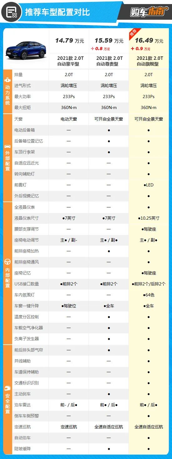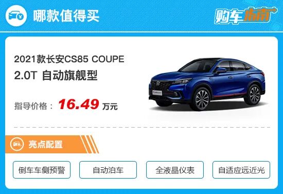 顶配车型2.0T 自动旗舰型售价达到了16.49万元,不过整体配置水平也确实更高,完全对得起这样的售价。相比尊贵型不仅配备了全套的主被动安全配置,还提供了自动泊车、倒车车侧预警等驾驶辅助功能,同时还升级为10.25英寸全液晶仪表,科技味道更浓。此外,在灯光、座椅和外后视镜方面,推荐车型的配置也更加全面,提供了腰部支撑、座椅通风、驾驶席座椅记忆、自适应远近光、转向辅助灯、LED前雾灯、车内64色氛围灯、外后视镜记忆、外后视镜倒车自动下翻等丰富的功能,综合性价比优势更加明显,因此在2021款长安CS85 COUPE全系车型中更值得推荐。