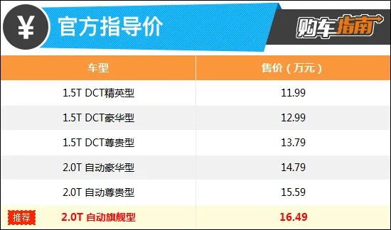 比两款豪华型再高一档的是尊贵型,分别为售价13.79万元的1.5T DCT尊贵型和售价15.59万元的2.0T 自动尊贵型。两款车型主要区别同样在于动力系统,而在配置方面,两款车型也是亮点颇多,比如增加了主动刹车、前雷达、全速自适应巡航、陡坡缓降、电动后备箱、全车玻璃一键升降、分区空调、车载空气净化器等诸多实用功能,并且2.0T 自动尊贵型在1.5T DCT尊贵型配置基础上还追加了前后排头部气帘、发动机自动启停以及前排座椅加热等功能。虽然配置方面稍稍领先,但两款车型在性价比上已基本没有优势可言,故不做重点推荐。