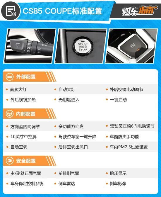 2021款长安CS85 COUPE的入门车型为1.5T DCT精英型,售价仅为11.99万元,10万元出头便能购买到一款中型SUV,确实非常有吸引力。况且,入门车型整体配置表现也并不寒酸,像前排正面气囊、前排侧气囊、胎压显示、车身稳定系统、倒车雷达、倒车影像以及上坡辅助等安全配置都没有缺席,同时还提供了无钥匙进入+无钥匙启动、远程启动、皮质座椅、驾驶席座椅电动调节等舒适性和便利性配置,可以满足基本用车需求。不过,在日常使用频率较高的灯光、多媒体以及空调方面,入门车型的配置还是略显中规中矩,仅提供了卤素大灯,中控屏幕尺寸也仅为10英寸,并且虽然配备了自动空调,但并没有提供实用的分区和空气净化功能,这些配置对于家用SUV来说还是比较重要的。另外,入门配置只提供了1.5T发动机,在动力选择上也较为单一。由此来看,入门车型只适合那些预算有限且对配置要求不高的消费者。