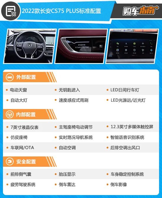 2022款长安CS75 PLUS入门版车型的配置表现可圈可点,较为丰富的舒适性和实用性配置完全可以满足一般家庭使用需求。不过作为一款自主品牌SUV车型,潜在用户对高阶配置更为看重,稍微增加一些预算就可以得到堪比豪华品牌中高配车型的体验,何乐而不为呢?
