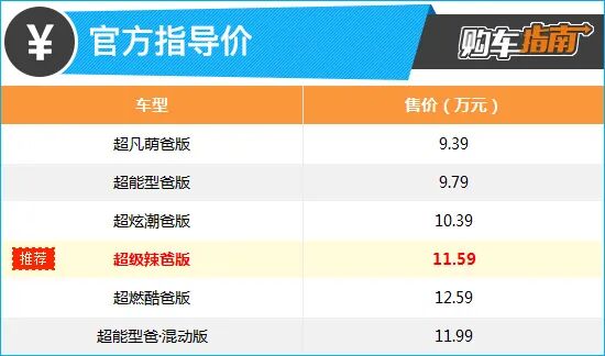 比推荐车型低一档的超炫潮爸版,价格与推荐车型相差1.2万元,实际配置水平与次低配车型比较接近,性价比显然不如超能型爸版。至于顶配车型超燃酷爸版,价格比推荐车型高出了1万元,实际仅增加了自动泊车和遥控泊车功能,实用性一般同样不作为重点推荐。而作为全系唯一的混动版车型,超能型爸·混动版售价达到11.99万元,已经超过推荐车型的价格,但是整体配置却仅达到了次低配车型的水平。因此综合各方面因素考虑,价格适中且在安全性和舒适性配置方面表现出色的超级辣爸版性价比更高,购买时建议优先考虑。