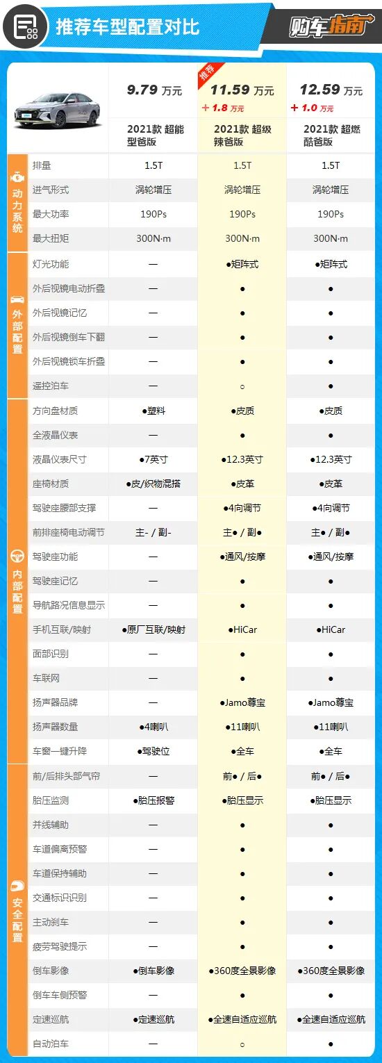 相比之下,编辑更加推荐售价为11.59万元的超级辣爸版,虽然相比次低配车型超能型爸版贵了1.8万元,不过却增加了大量的主被动安全以及舒适性配置。安全方面,推荐车型搭载了全套的驾驶辅助功能,包括常用的并线辅助、车道偏离预警、车道保持辅助、交通标识识别和全速自适应巡航,此外还将倒车影像升级为360度全景影像,并配备了车侧盲区预警,为狭小车位停车提供方便。而在日常使用频率较高的座椅和多媒体方面,推荐车型还配备了驾驶座腰部支撑、驾驶座通风/按摩/记忆、前排座椅电动调节、12.3英寸全液晶仪表盘、车联网、面部识别以及11个喇叭的Jamo尊宝音响系统,进一步提升驾乘体验。
