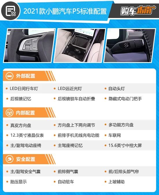 而推荐车型和顶配600P版本相比,顶配车型虽然在续航上增加了50km,同时,内饰层面也升级为Nappa真皮座椅,并具备加热和通风功能,同时还增加了副驾座椅记忆、副驾后座调节按钮、8喇叭音响、车内香氛装置等,但2.4万元的差价对照这些配置来看,显得不太划算。综合来看,如果您近期想购买2021款小鹏P5,那么550P版本车型相对性价比更高,在购车时可优先考虑。