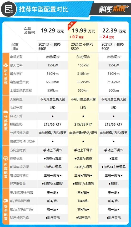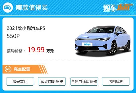 综合配置信息,向您推荐2021款小鹏P5 550P版本车型。作为一款次顶配车型,该车最大的亮点在于配备了2个激光雷达,这也使得小鹏P5具备了和顶配车型600P版本相同的XPILOT 3.5智能辅助驾驶系统,这项配置就目前来看,市面上还比较少见,而解锁此项功能只需要多花费7000元。同时,整车价格也控制在了20万元的大关内,相对来说性价比较高。而500E版本虽然续航、大部分配置都和550P版本相同,但该车只能实现XPILOT 3.0智能辅助驾驶系统,而这样的辅助驾驶功能在当前来看,已经不是什么新鲜事,具备同样辅助驾驶功能的新能源车型大有人在。