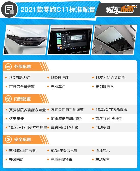 零跑C11全系标配无框车门、三联屏多媒体系统以及各项安全配置和辅助驾驶硬件等,因此入门版车型的性价比表现十分突出。其实就实用性及科技配置而言,最低配的“豪华版”绝对堪称“豪华”,配备有LED自动大灯、可开启式全景天窗、车联网、OTA升级以及丰富的主被动安全系统,相当值得购买。
