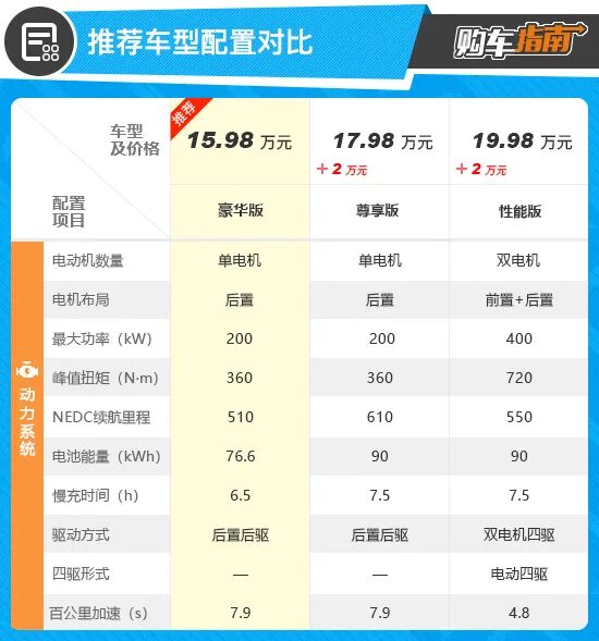 综合配置差异,编辑认为售价为15.98万元的入门车型更值得推荐。尊享版相较推荐车型贵了2万元,配置及动力均没有任何变化,只是将电池组容量由76.6kWh提升至90kWh,续航里程也增加到了610km。因此,除非是对续航里程有硬性要求,否则为了这100km的续航里程多花费2万元,着实不值。